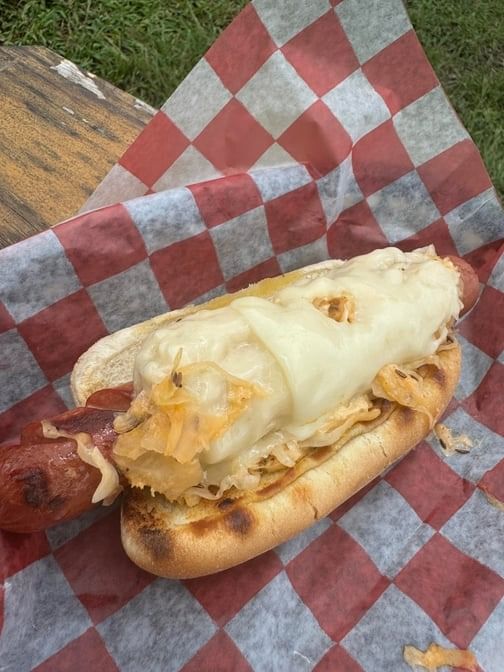 A jumbo all-beef hot dog grilled to perfection on a toasted bun. Topped with hot sauerkraut and house Russian dressing, caraway seeds and melted swiss