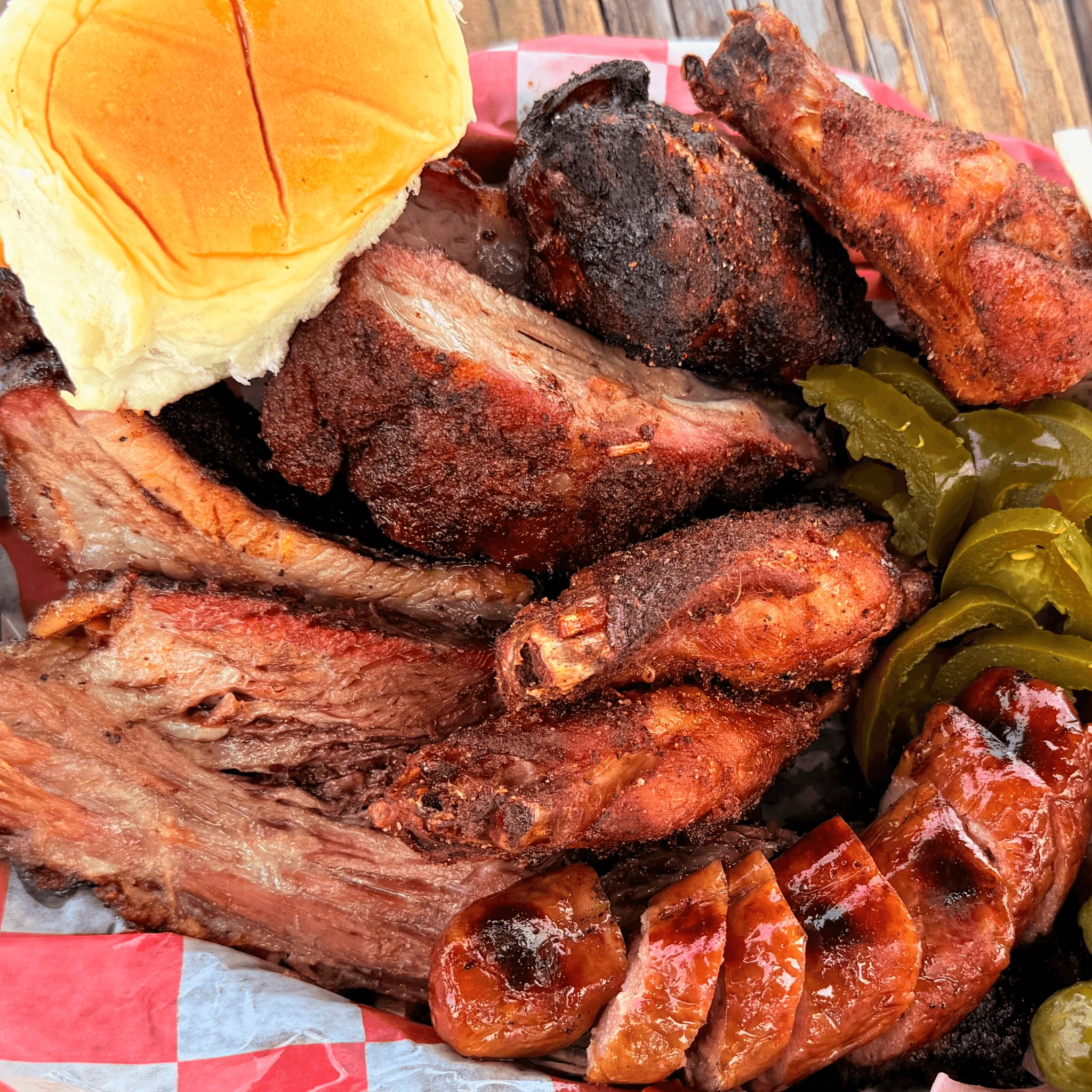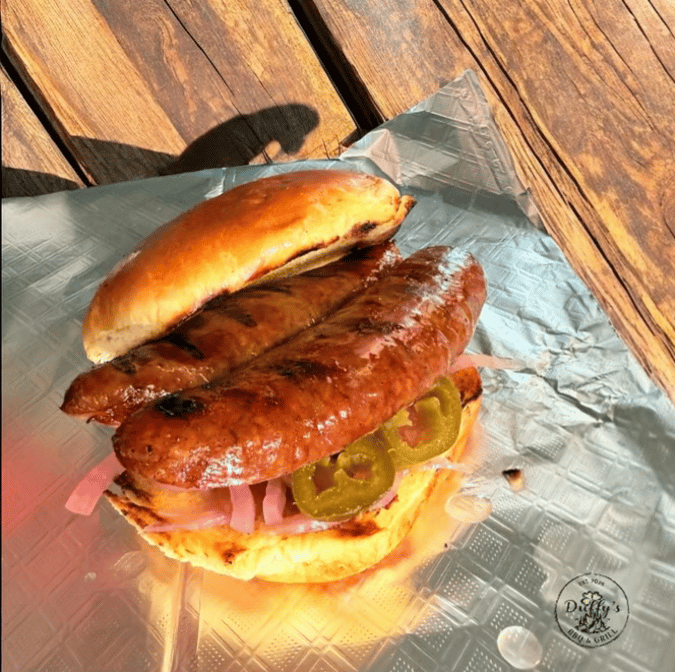 Smoked brat split in half and cooked to perfection on the grill. Served on a toasted brioche bun with pickled jalapenos, and pickled red onions