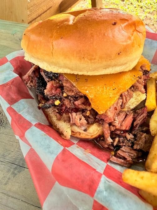 Toasted brioche bread with melted American cheese, and our slow smoked chopped brisket. Comes with choice of one side and a drink.