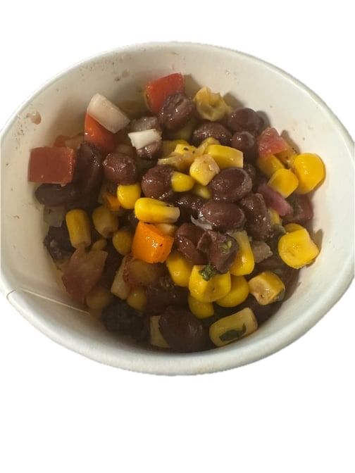 Black beans, corn, red pepper, and jalapenos, , dressed with a zesty cilantro lime vinaigrette